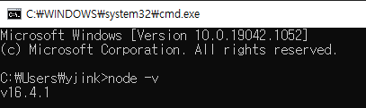 node -v명령 입력 (설치 및 버전 확인)