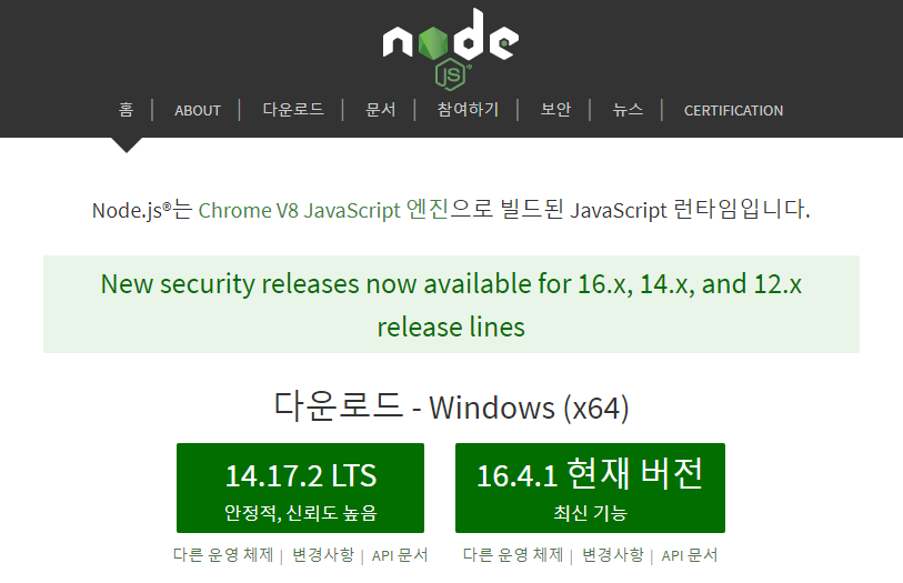 - Node.js 다운로드: https://nodejs.org/ko/