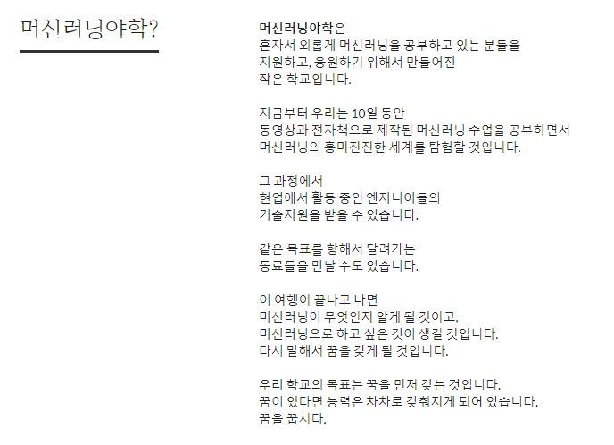 머신러닝1은 머신러닝을 처음 시작하는 분들을 위한 교양수업입니다. 이론과 수학 그리고 코딩을 철저히 감추고, 머신러닝을 우선 경험해볼 수 있도록 설계된 수업입니다.